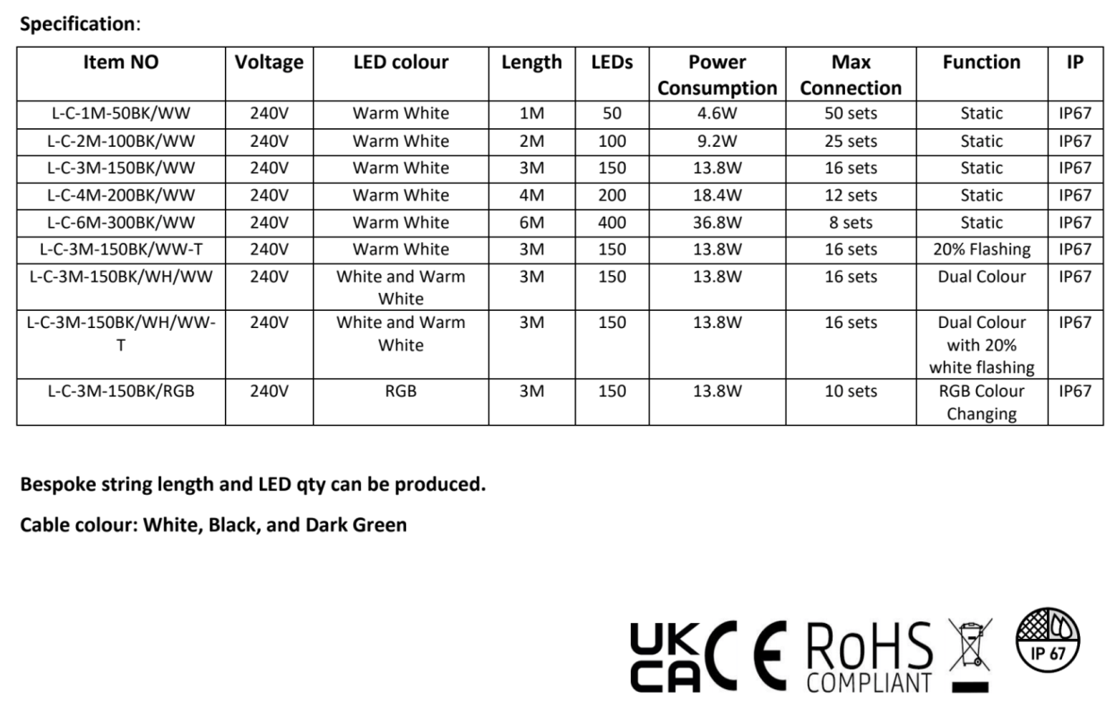 240V, LED-Cluster-Licht, Gummikabel, Länge nach Maß, LEDs nach Maß, anschließbar, einfarbig oder zweifarbig, IP65, für den Außenbereich.