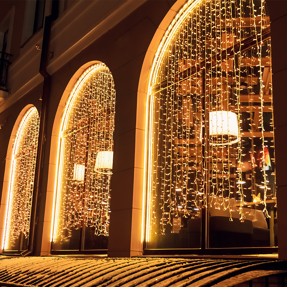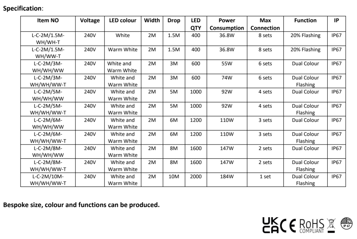 Câble en caoutchouc très résistant, largeur sur mesure, longueur de chute sur mesure, couleur unique ou bicolore ou couleur RVB, statique ou avec LED blanches clignotantes 20%, connectable, IP65, utilisation en extérieur.